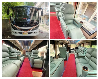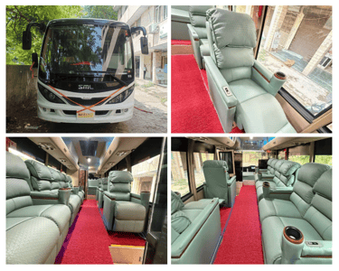 Sofa cum bed, recliners seats, air suspension, washroom, fridge, microwave, TV, Wi-Fi, and water tank.