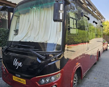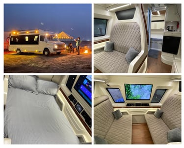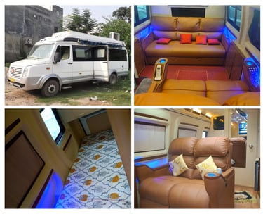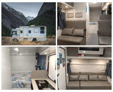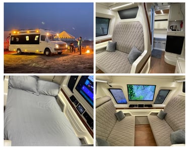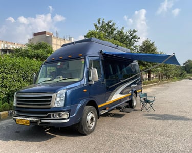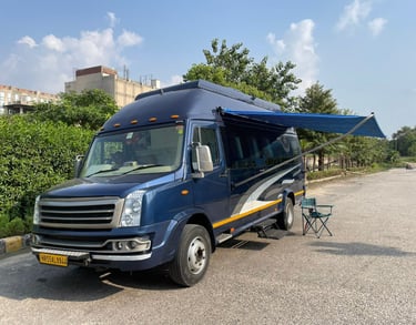 Our fleet of high-end caravans includes everything from compact campervan rentals in Delhi to spacious RVs in India, all loaded with essential amenities like sleeping berths, kitchenettes, private washrooms, AC, entertainment systems, and Wi-Fi. Every unit is GPS-enabled, thoroughly sanitized, and maintained to the highest standards.